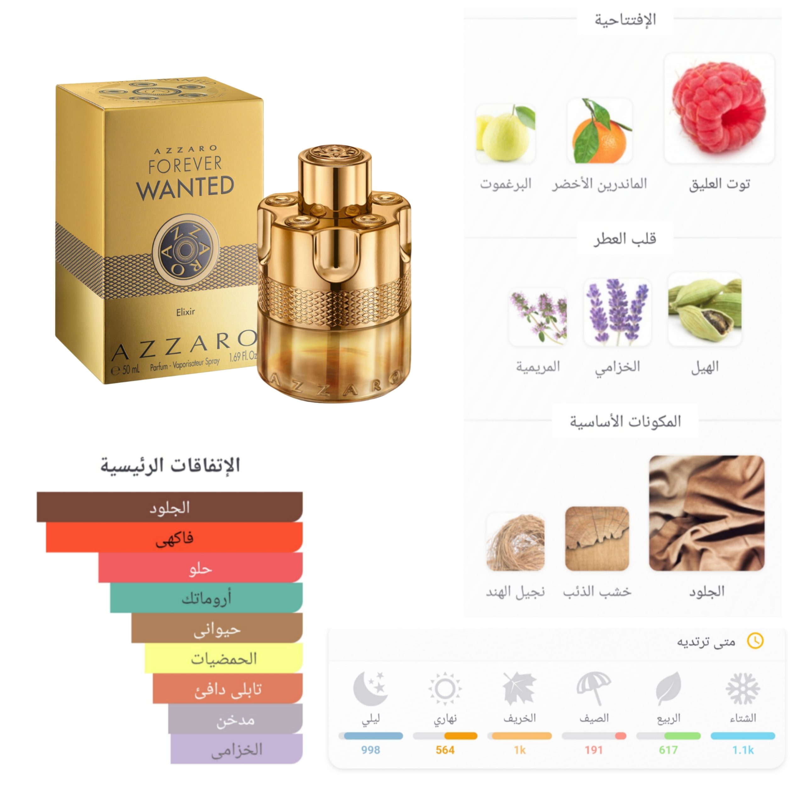 افتتاحية فاكهية جميلة من رائحة التوت 🫐 مع رائحة الهيل ، سرعان ما ينقلب العطر ليستقر على رائحة جلدية رجولية فخمة 🖤